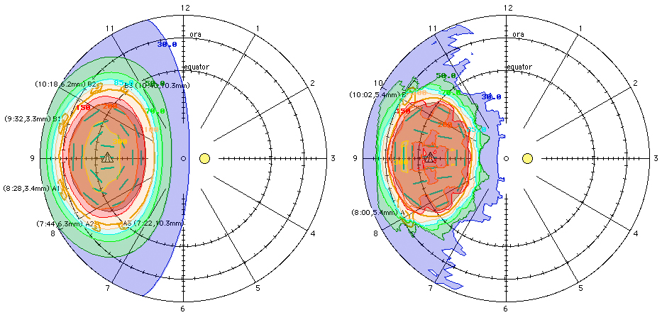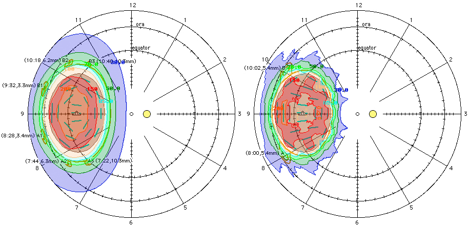 Compare the portion of the eye enclosed within the 200 Gy and 30 Gy isodose lines. The Eye Physics plaque (on the right) produces a more homogeneous dose distribution in the target volume and a steeper gradient outside the plaque perimeter. The Plaque Simulator software provides precise suture eyelet coordinates to assist the surgeon in placing the plaque at the planned location on the eye. |