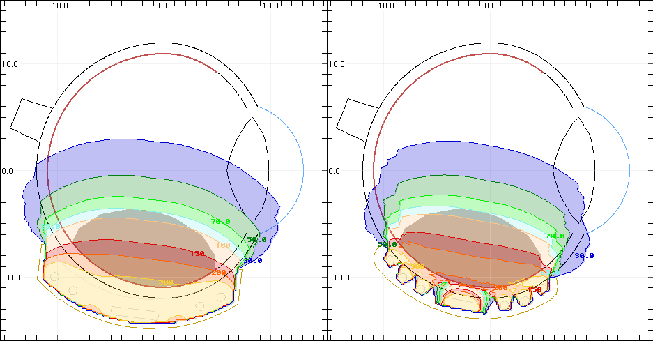 Tumor 14mm circular base x 7mm height, left: COMS-18mm plaque with 21 seeds, right: Eye Physics 3rd generation model 1921-24-0.90 anteriorly oblate plaque with 21 seeds.