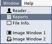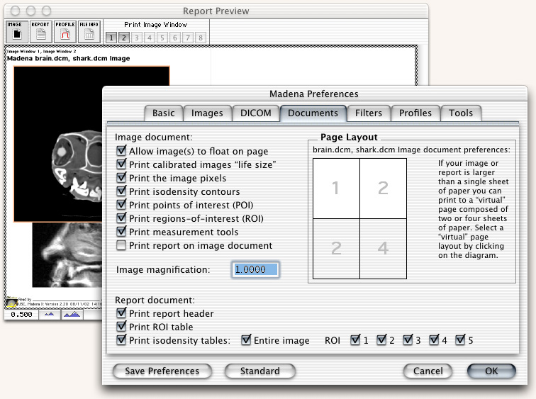 Madena 2.x provides three printable documents: Image, Report, Profile and File Info. To view and/or print an image or report, select Reports from the Window menu and then click the Image button in the toolbar at the top of the reports preview window. If you have more than one image window open, the image(s) that will be printed are indicated by the "Print Image Window" buttons in the tool bar. Images being printed are also marked with a printer icon in the Window menu. To add additional images or to remove an image, click one or more of the "Print Image Window" buttons in the toolbar or select an image window from the Window menu. Whatever is currently displayed in each image window is what can be printed, including fused images, regions, measurement tools, isodensity contours etc... The actual items which will be printed are selected in the Documents tab of Madena's Preferences dialog. For instance, you could elect to print only the isodensity contours and measurement tools but not the image pixels. This can be useful for comparing isodensity contours from two images.
