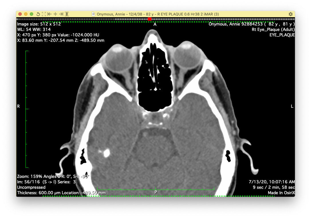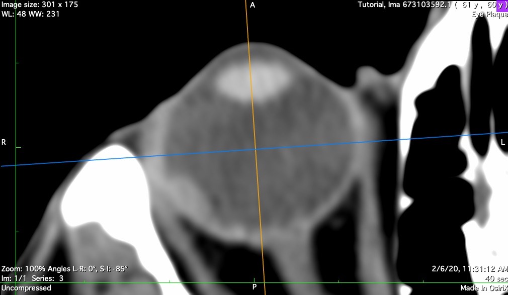 An axial imaging frame that includes the involved eye and at least half of the opposite eye is also acceptable as illustrated below.