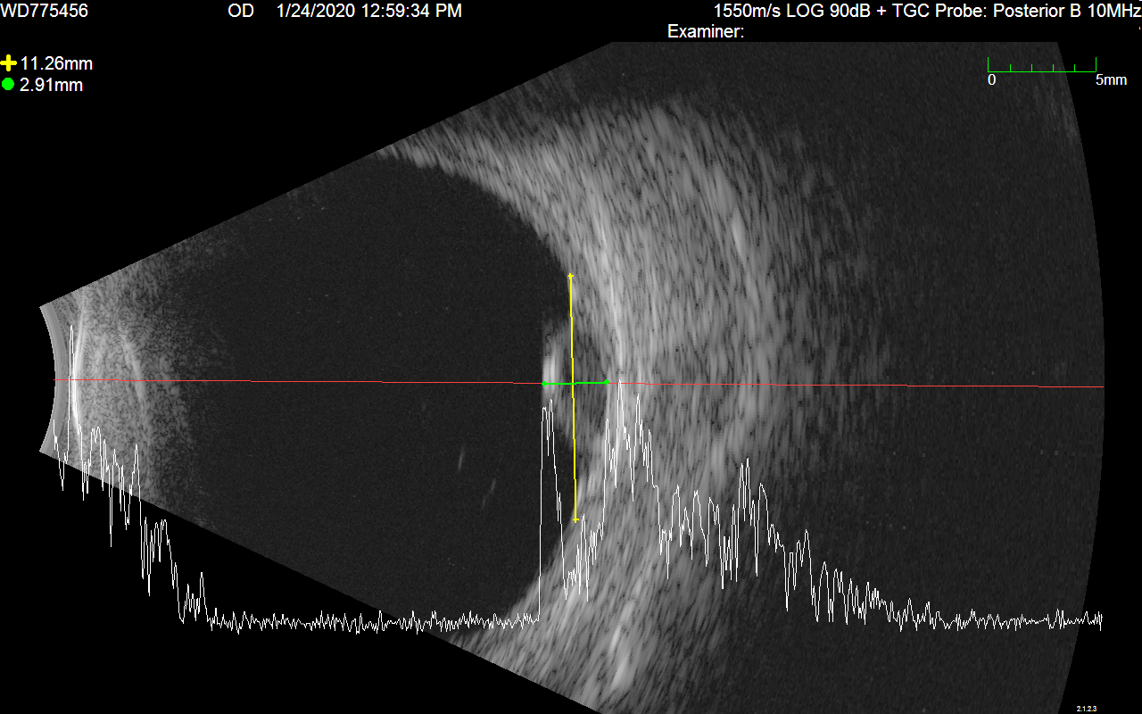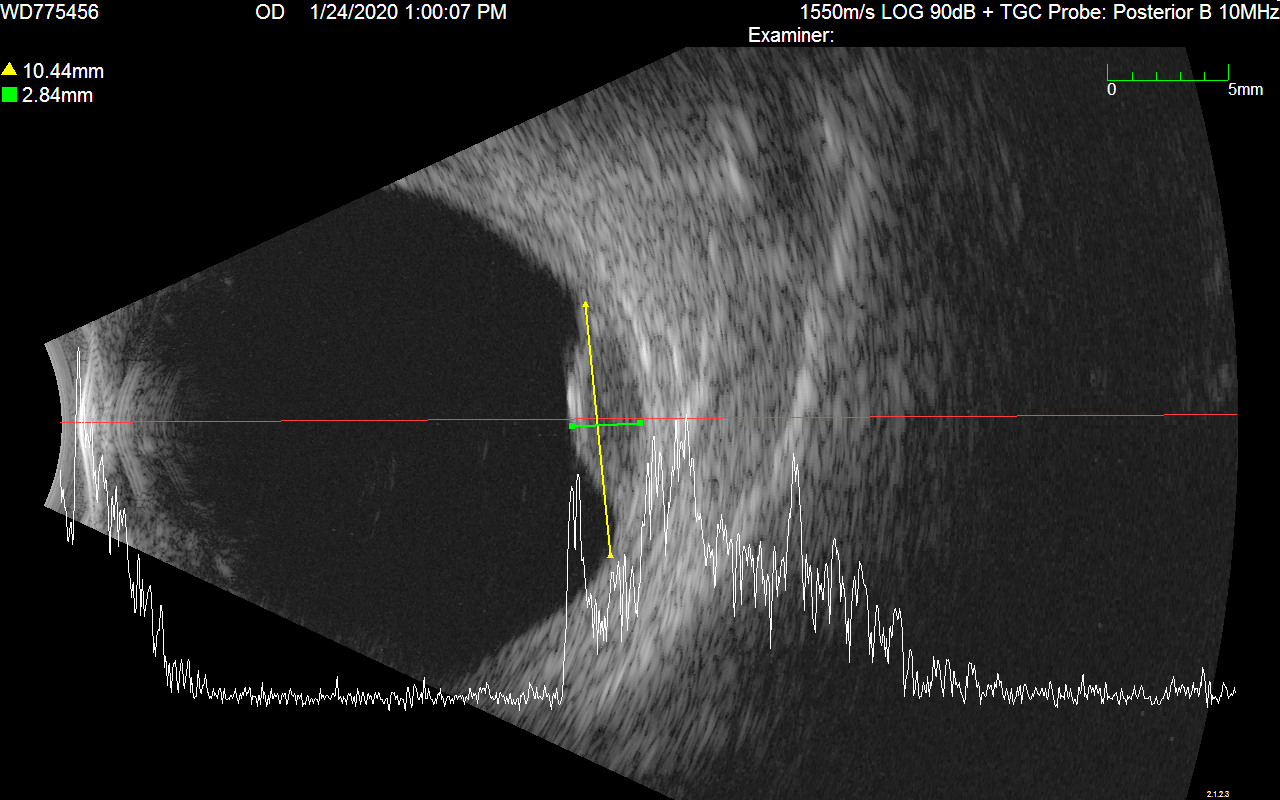 A pair of ultrasound b-scans are used to determine the elevation of the tumor. Ideally, these images should illustrate cross-sections of the longest dimension of the tumor, and a plane perpendicular to that longest dimension. Radial and circumferential cross-sections are also acceptable. Eye tumors are often not clearly visible in CT (or MR) imaging alone. Ultrasound b-scans provided the most accurate measurements and cross-sections of ocular tumors for treatment planning purposes.