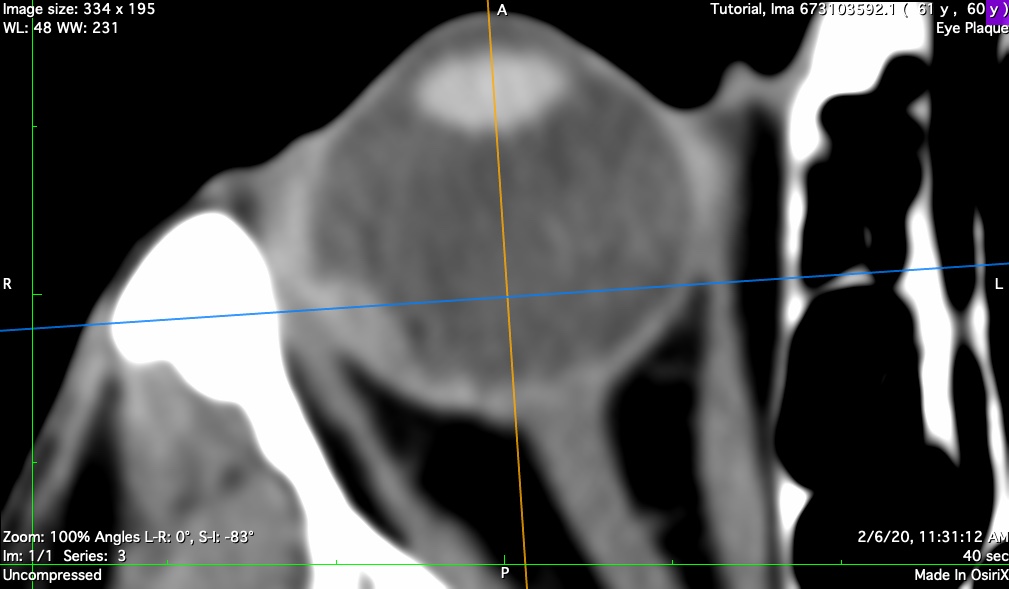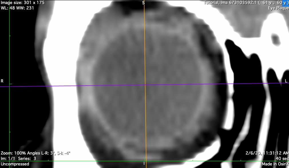 Axial bisecting reconstruction. Used to determine optic disc center, nerve sheath diameter, and anterior oblateness of the eye. The sheath diameter determines how closely the plaque shell and seeds can approach the disc. This distance becomes important for extremely posterior and peripapillary tumors.