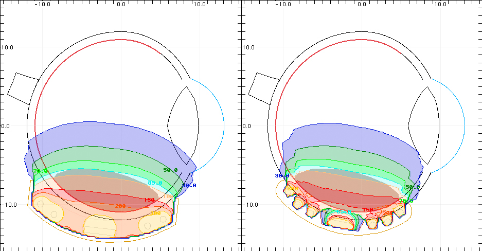 Tumor 14mm circular base x 7mm height, left: COMS-18mm plaque with 21 seeds, right: Eye Physics 3rd generation model 1921-24-0.90 anteriorly oblate plaque with 21 seeds.