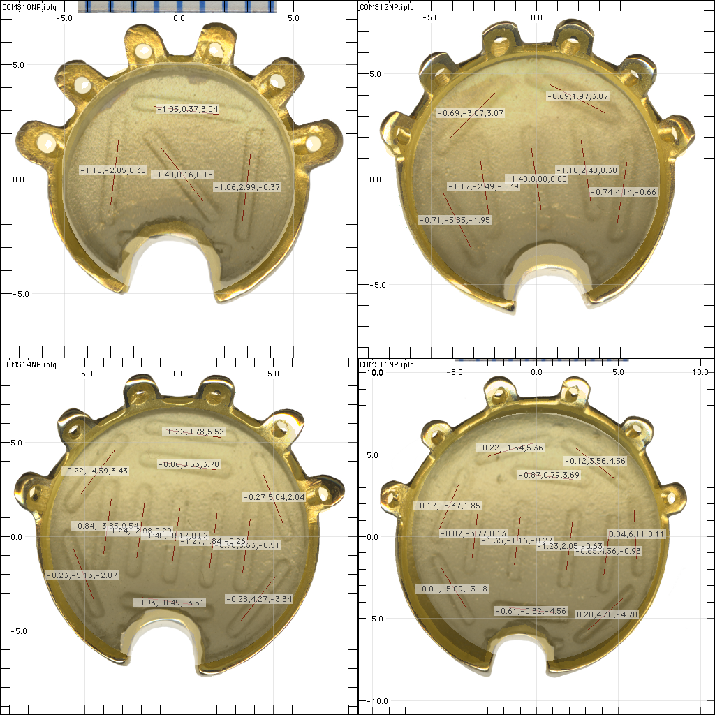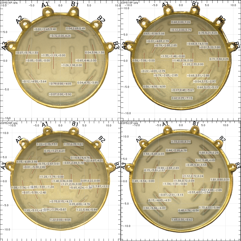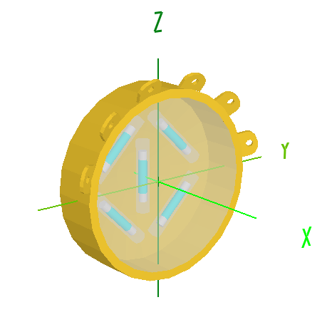In COMS style plaques, the radionuclide seeds are inserted into slots molded into the convex (back) side of a flexible silicone seed carrier. The slots are intended to offset the seeds by 1 mm from the concave (facial) surface of the plaque. The slots in the carrier are slightly longer and deeper than the seeds. This introduces a small uncertainty with regard to the seed position within a slot. For instance, depending upon the skill of the person assembling the plaque, or jostling during sterilzation, some seeds might end up slightly more than 1 mm from the face of the plaque. The seed carrier is then inserted into the gold shell. Because the carrier of unnotched plaques can rotate within the shell, additional uncertainty is introduced. For instance, depending upon the skill of the person assembling the plaque, the rotational orientation of the carrier within the shell might vary by a few degrees from the intended plan. This flexible carrier system carries the potential for some uncertainty between the seed positions and the suture eyelets of the shell, and hence adds uncertainty to the calculation of dose to the tumor and critical structures within the eye. In general, this uncertainty is not dosimetrically significant with regard to the tumor, but might be significant at locations immediately adjacent to the plaque where the dose can depend upon the geometrical orientation of nearby seeds with respect to the collimating lip. Plaque Simulator includes 3D models of many of the COMS style plaques. Plaque Simulator uses a polar coordinate system to keep track of the center of each seed, the rotation of each seed about its own center, and the rotation of the entire silicone carrier within the plaque shell. For comparison with other treatment planning systems, Cartesian coordinates for the centers of seed axis placeholders in the carrier slots are illustrated below. These coordinates assume a 0.8 mm diameter seed. For example, when a seed is fully inserted into its slot in the carrier, the cylindrical surface of the seed will be offset 1 mm from the face of the plaque. The offset to the seed center will be 1.4 mm. Below are Plaque Simulator's coordinates based on the engineering models of the COMS plaques, followed by coordinates as determined from high resolution scans of actual samples of both standard and notched plaques. |