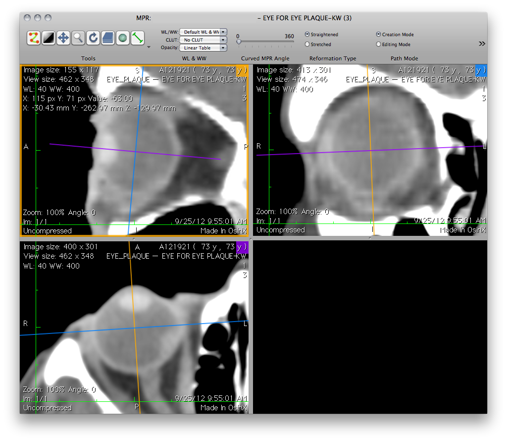 The primary purpose of CT and MR images in Plaque Simulator (PS) is to measure the size and curvature of the eye. This information is used to calibrate fundus camera images for fusion with the 3D model and to select a plaque model which fits the external curvature of the sclera. CT is preferable over MR because the sclera images more disinctly with CT, but either will work. A secondary purpose of CT and MR imaging is to locate and measure the tumor. In many instances, however, the spacing between CT and MR slices is simply too great to reveal ocular tumors. Locating and measuring the tumor is best accomplished using fundus photography and ultrasound as they have much better resolution than CT or MR for this purpose. However, in the case of very anterior tumors, fundus camera photography is not possible and ultrasound alone only provides the height and shape of the tumor dome. Thus, for anterior tumors, CT or MR reconstructions are sometimes the only way to accurately determine the longitude and lattitude of the center of the tumor mass. At minimum, Plaque Simulator expects one CT (or MR) image that bisects the eye in the meridian plane that includes the anterior pole of the eye at apex of the cornea, the posterior pole at the retina, the lens, and the optic nerve where it joins the eye. If 3D multiplanar reconstruction (MPR) is not available, this image can be closely approximated by a transverse axial CT or MR slice which bisects the eye at the nerve. Since the CT image is primarily used to determine the dimensions and shape of the eye it is not important that the tumor be visible in the slice. The image can be provided in any Quicktime compatible image file format, the most common being .jpg, or as an uncompressed DICOM file. Quicktime images (e.g. .jpg, .tif, .png) must have a calibration ruler visible in the image! Images that come on film can be digitized to .jpg files using a flatbed scanner with transparency capability. |
