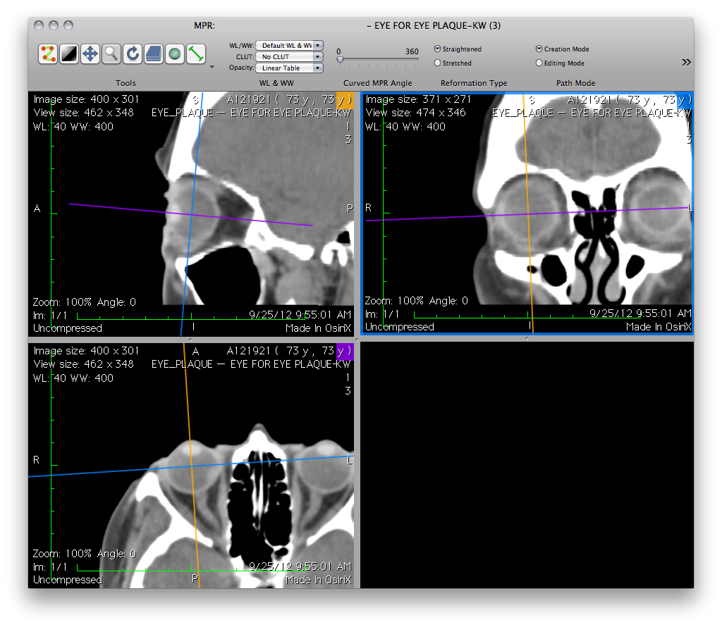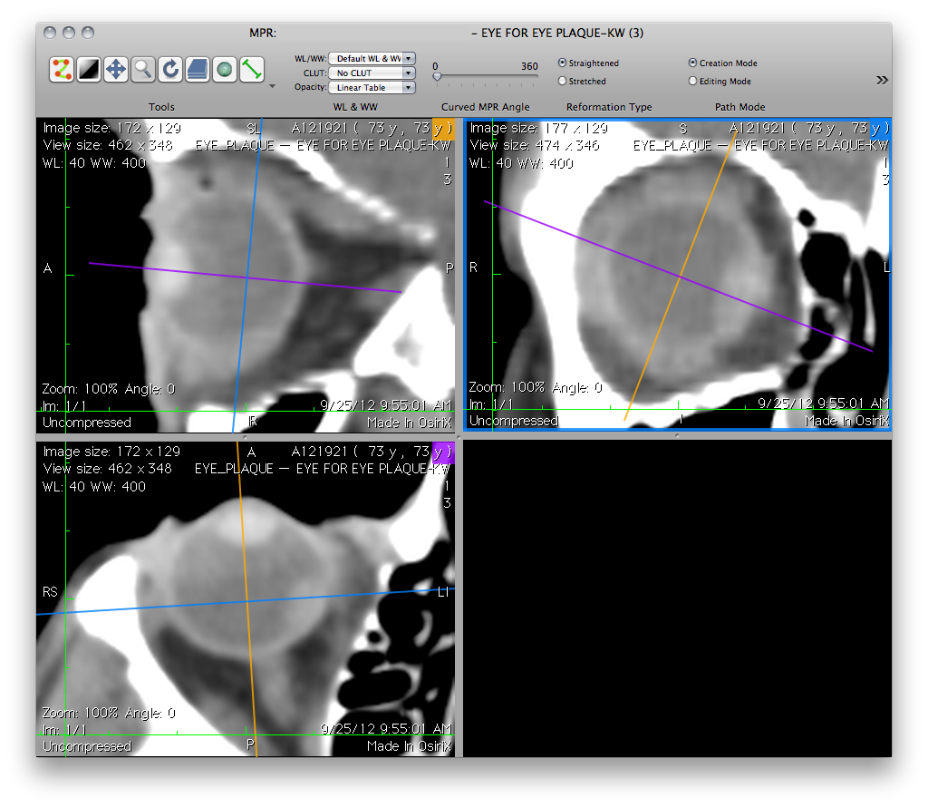 OsiriX is a DICOM listener and viewer that can manipulate 3-D data sets and export reconstructions of axial, equatorial and sagittal planes which bisect the affected eye as .jpg files. Other reconstructions of interest are the meridian and coronal planes which intersect the tumor apex.