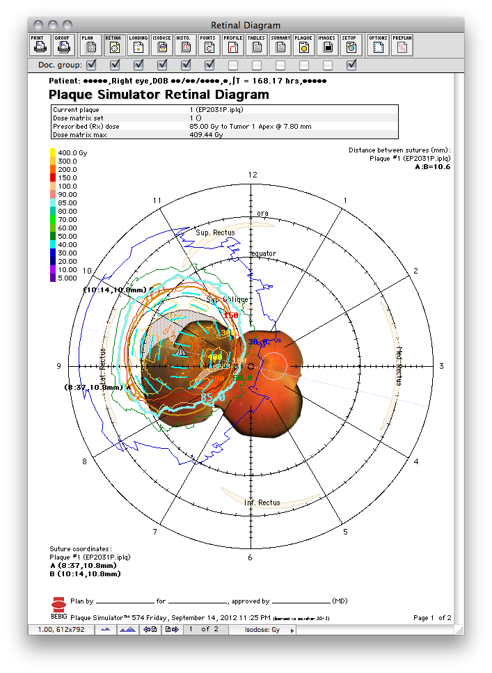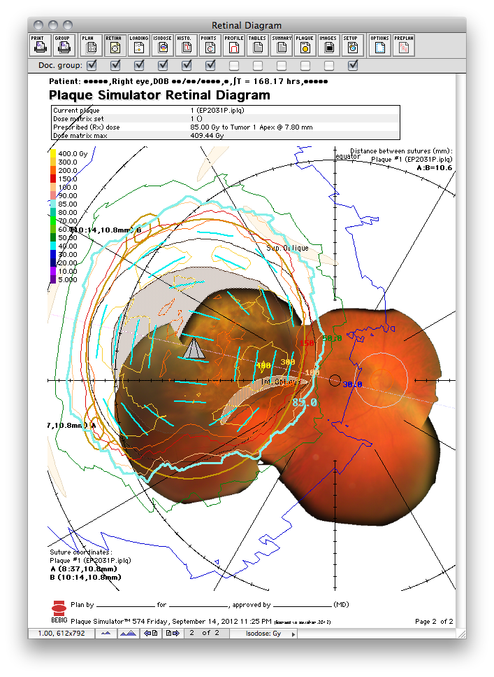 - Page 1 summarizes which eye, the tumor location, the intended plaque location and orientation, scleral suture coordinates (ie meridian hour and chord distance from the limbus), and the chord distance(s) between the suture eyelets of the plaque. This document provides a "road map" for the ophthalmologist during the implant surgery and should always be printed.