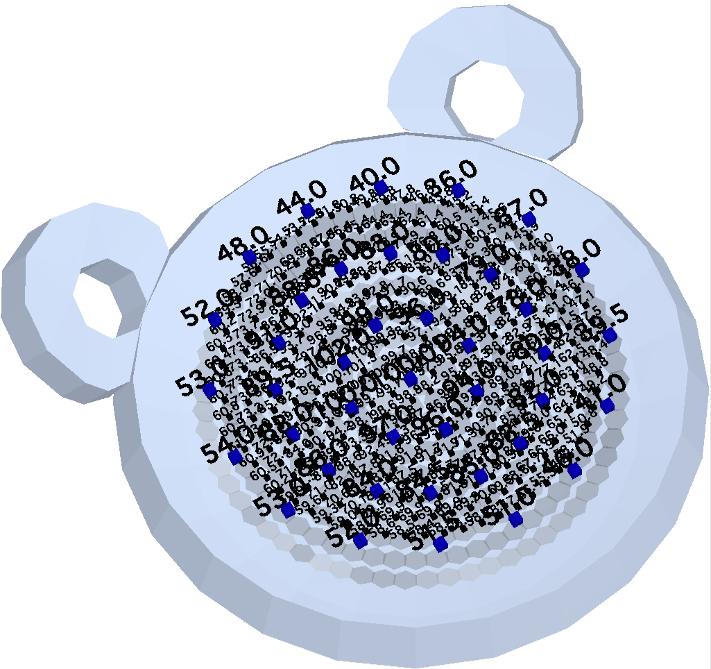 • To perform the simulated annealing, PS calculates a control point (the hundreds of small black cubes and text in figure to right) 1 mm above the center of each patch source (illustrated as hexagons) and angularly interpolates normalized dose rate target values from the measured data points (the larger blue cubes with larger text labels in the figure).