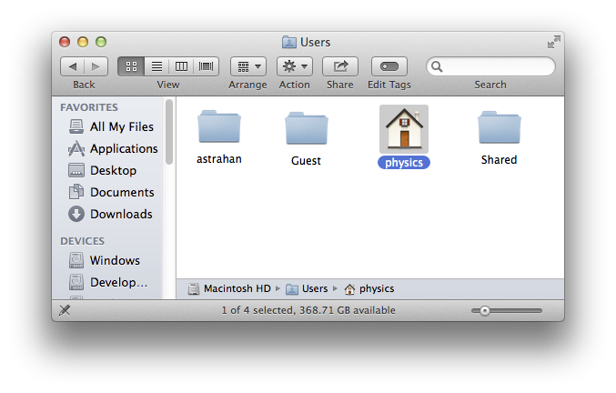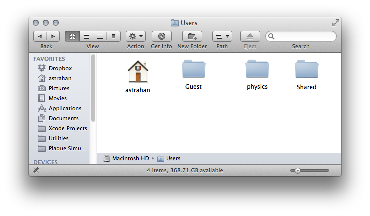 In order for the Plaque Simulator application itself to work with multiple OSX users you will need to enable file read and write privileges for the Plaque Simulator Data folder located in your shared root level Applications folder for every OSX user of Plaque Simulator (e.g. the OSX user named Physics as illustrated above) or simply allow everyone to read and write to the files in the Plaque Simulator Data folder. This applies especially to the SQLite database and PSLog files, but affects a number of other support files as well. In the OSX Finder, login as the administrator (or a user with admin privileges) and navigate to the Plaque Simulator folder in the root level Applications folder and select the Plaque Simulator Data folder.