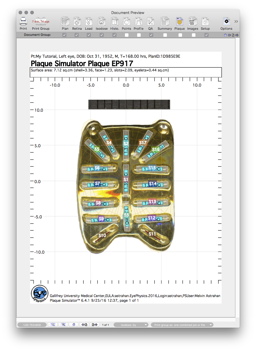 The Plaque document prints 1 page for each dosimetrically included plaque.