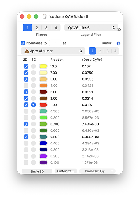 The Isodose window should already be configured as illustrated below with isodose normalization enabled and set to 1.0 at the apex of the tumor (ie the same as the prescription (Rx) point). If the legend doesn't match, select the legend file QAV6.idos6 from the popup menu.