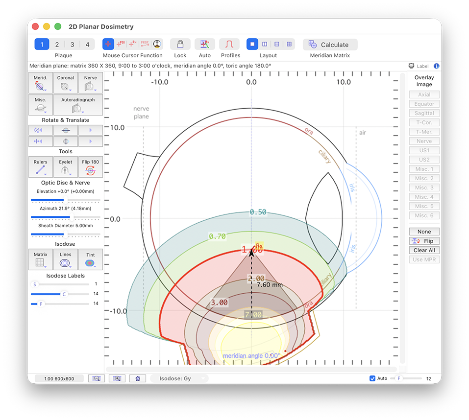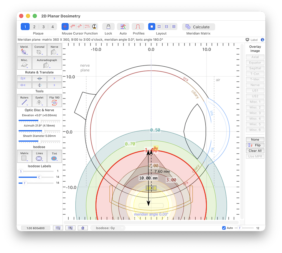 After offsetting the plaque and calculating dose matrices, the Planar Dosimetry window should look like this (you may optionally disable rulers in the planar dosimetry window to recreate this screen capture):