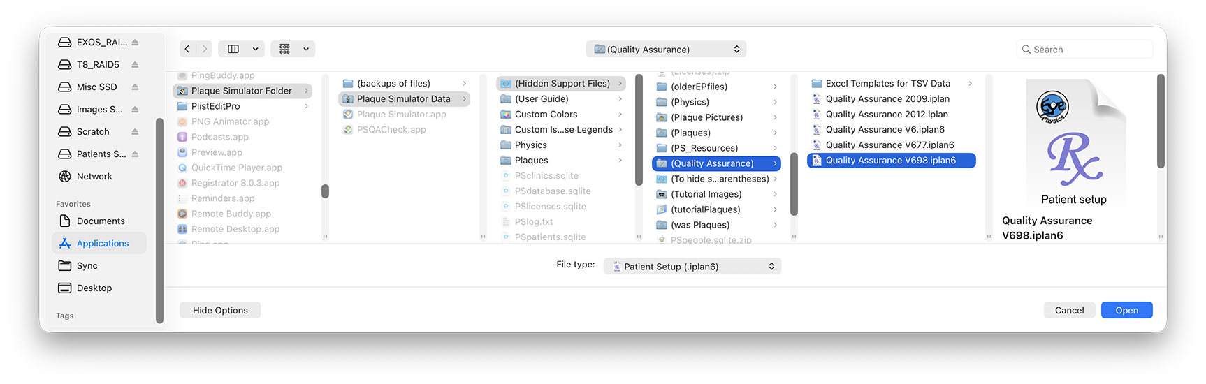 The QA file Quality Assurance V698.iplan6 is located in the Macintosh HD/Applications/Plaque Simulator Folder/Plaque Simulator Data/(Quality Assurance)/...folder. A duplicate copy is installed in the Plaque Simulator Patients/(Quality Assurance)/... folder.